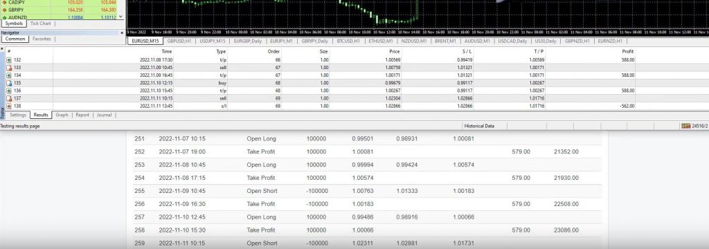 Now let’s take a look at some profitable results from the expert advisor. Within 24 hours, we made a profit of $1547.27, which is about 15% of the account. We had a small profit with S&P 500, and both expert advisors caught an awesome move with Bitcoin, bringing in about $945 each. However, we did have one losing trade with EURUSD.