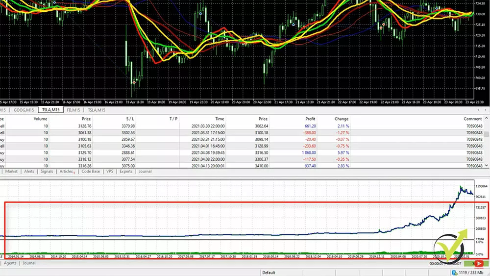 Another notable feature in MetaTrader 5 backtesting is the ‘Graph’ tab. This tab presents a graphical representation of the trading strategy’s performance over time. It becomes particularly useful in understanding how a strategy fares in different market conditions. For example, in recent months, the market for Tesla stocks has been quite volatile. The ‘Graph’ tab clearly shows the strategy’s performance during these periods, highlighting significant movements and results. In this case, it demonstrates that the strategy achieved impressive profits amidst the market’s volatility.