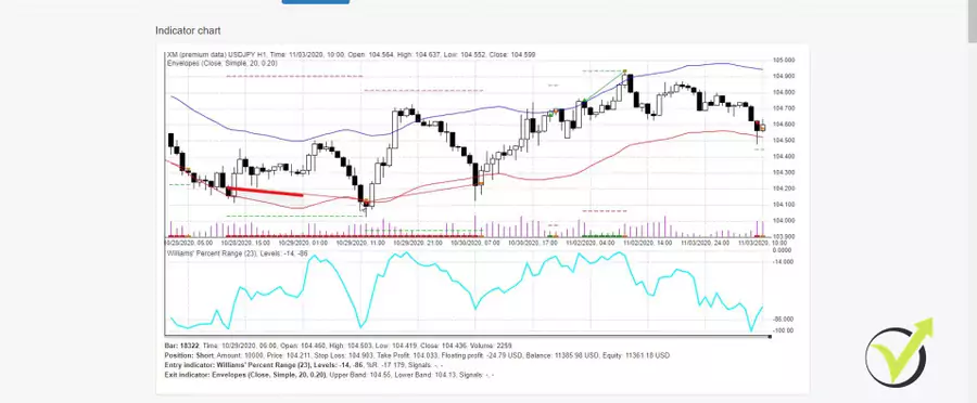 Let’s take a look at a strategy created in EA Studio. This strategy uses the Bollinger Bands and William’s Percent Range as it’s entry indicators, and The Envelopes as it’s exit strategy, all with custom settings.