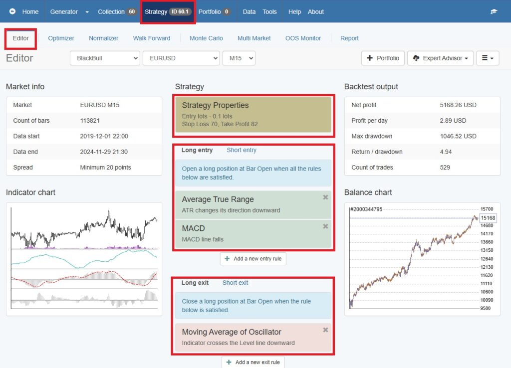 EA Studio’s Strategy Editor also includes detailed entry and exit rules. For instance, the Williams’ Percent Range is used as an entry indicator, with specific conditions like crossing the level line upward. For exits, the Envelopes indicator is employed, with conditions such as the bar opening above the Upper Band after opening below it. These indicators and conditions are crucial for defining the strategy’s operational parameters.