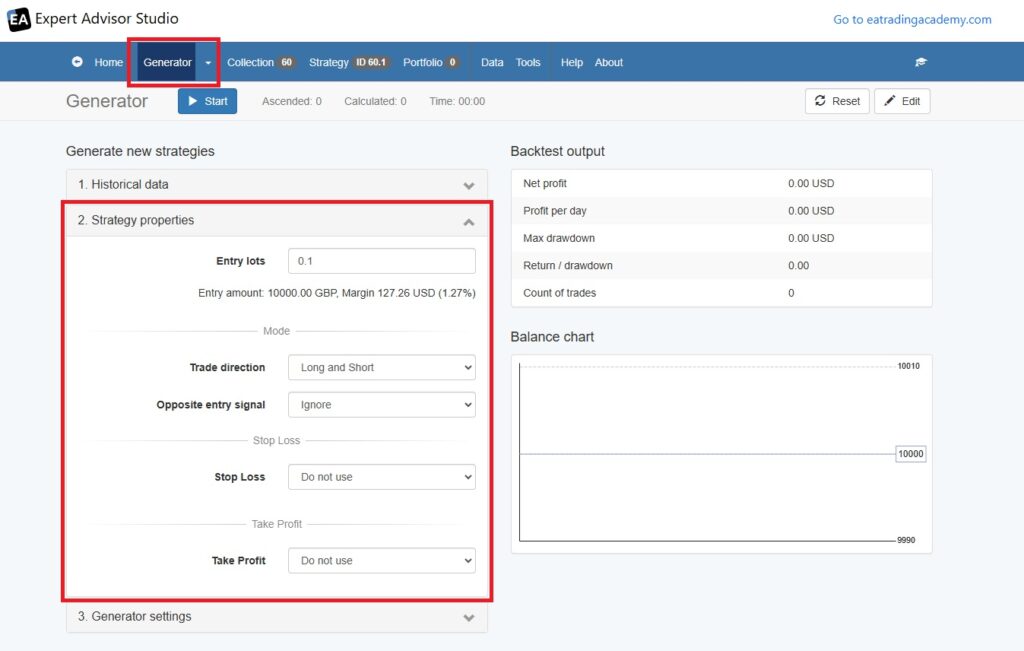 Note, this is in the context of backtesting strategies. This is just one of the many features of EA Studio, not least of which is it’s ability to automatically create strategies, based on backtesting over historical data. You can select and adjust these dates as needed when using the Generator. We’ll look at this in more detail in the Data Horizon section below. You can also create your Expert Advisors from scratch with no programming or coding experience required. Let’s discuss this in more detail.