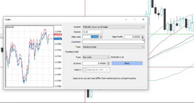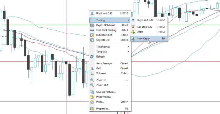 We exit because of a different trading rule. Also, we have a Stop Loss and a Take Profit. The Stop Loss is a level at which the trade will close automatically. It is easy to set. So if I want to sell, I would go to Trading, and I would go to New Order.