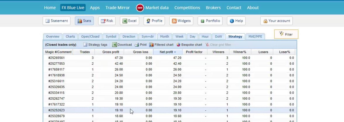 But even if I arrange it according to the Magic Numbers, it’s hard to see which simple Forex trading strategies are profitable, which ones are losing, and which are the most profitable. You need to calculate it or put it in Excel and do some calculations from there.