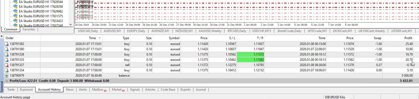 So on the account history, we see the closed trades. And these are the actual results that we have from these simple Forex trading strategies. Now, having the account history when we trade with Expert Advisors is really a headache to follow the results.