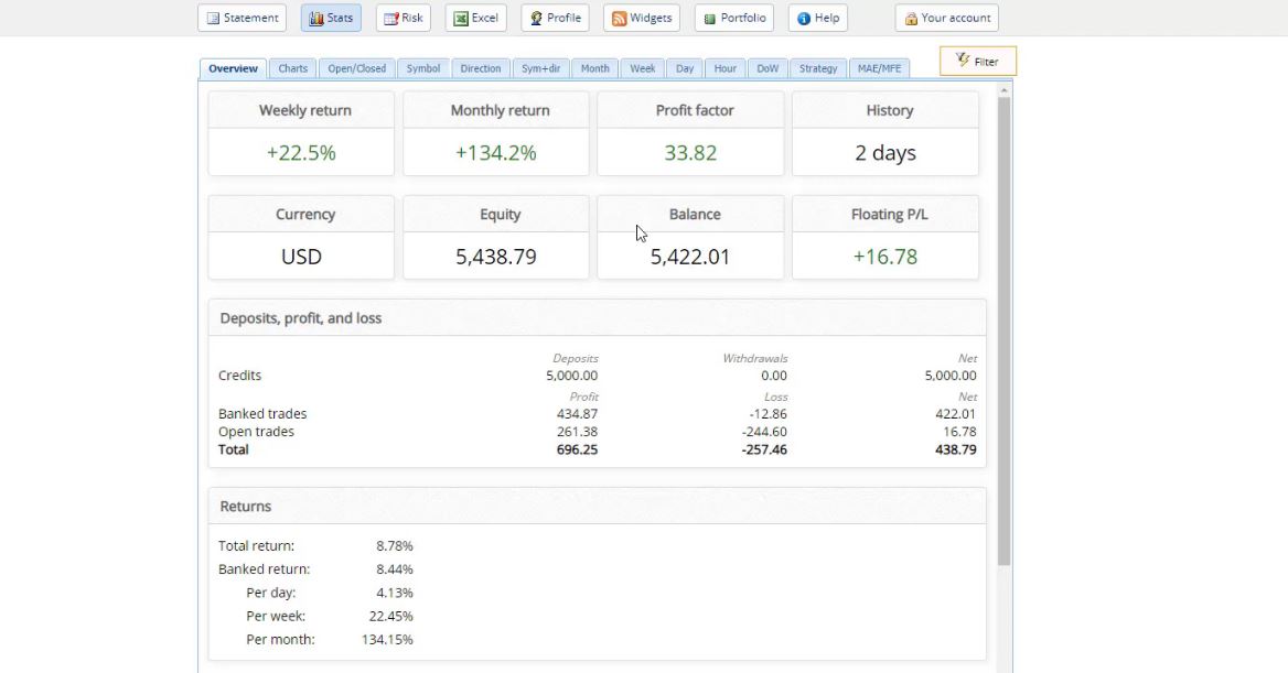 As I said, what we are focused on is the account history. Basically, the closed trades that we have so far. And we have just 2 days of history and it’s even less because I placed the Expert Advisors yesterday. And then we have a lot of statistics, charts, and the balance line is just great at the moment.