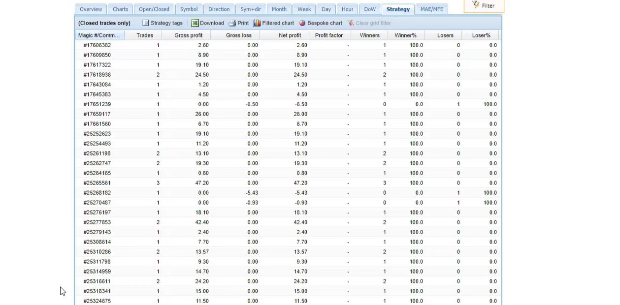 The most realistic test is to test these Simple Forex Trading Strategies on the current market, on the current market conditions when you will actually be trading with them. So we can see 1, 2, 3, 4, 5, 6, 7, 8, 9, 10. For the current moment, these Expert Advisors until the one with Magic Number ending in 623 are the Expert Advisors that make the most profit.