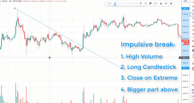 And we have an impulsive break. An impulsive break is defined when we have high volume, we have it below, we have a long candlestick, we have close on extreme which means that the candlestick will close near the top. It will not do a move like that.
