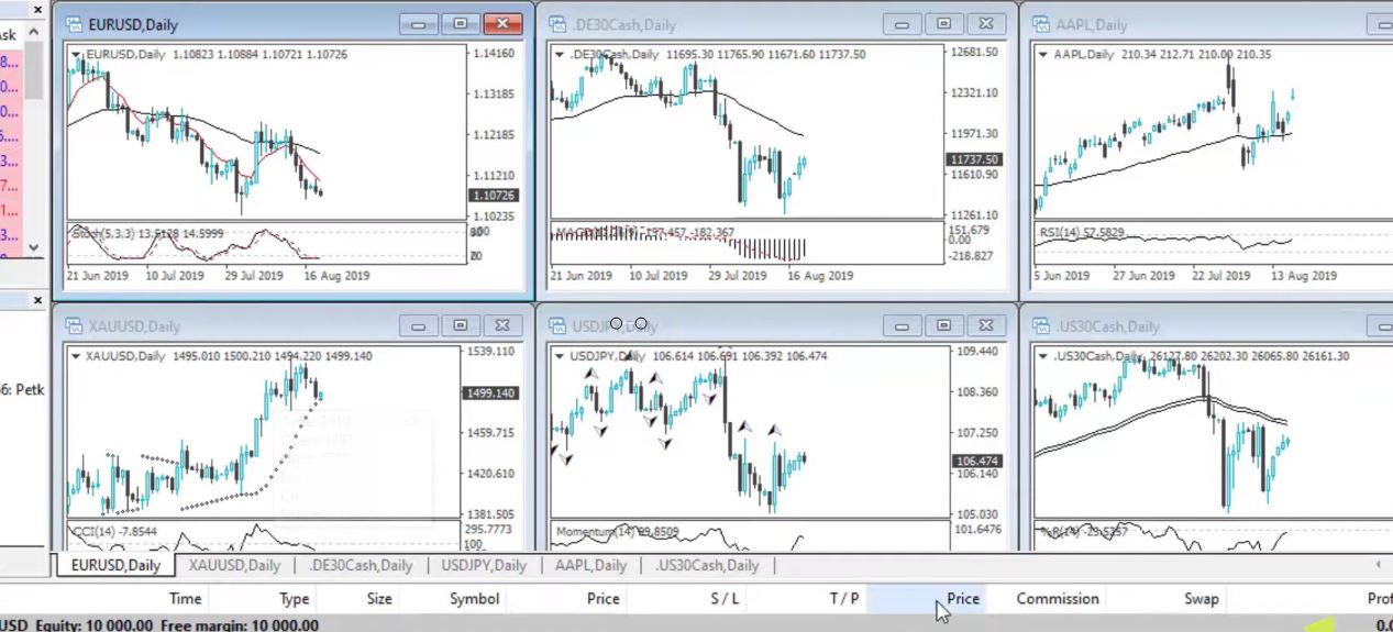 So here you can see that I have opened EURUSD, the Gold, some indexes, USDJPY, and AAPL. Be sure to check out the lecture where we explain how to place a trade in MetaTrader 4 if you aren’t familiar with trading.