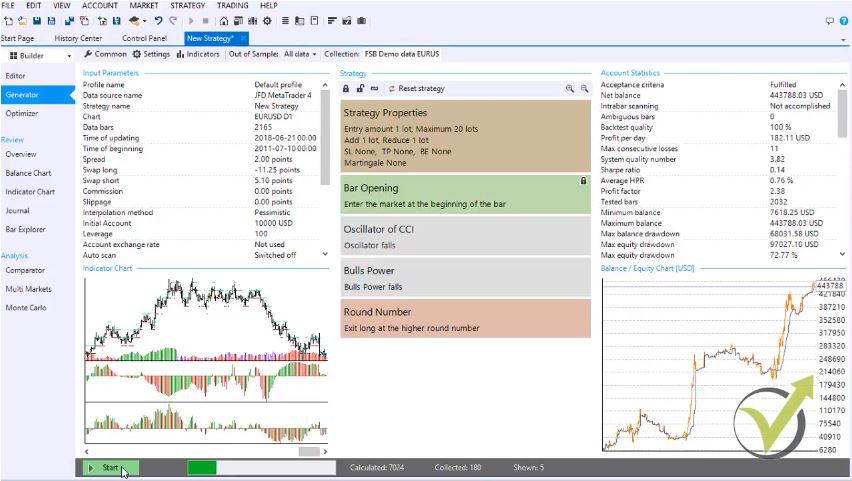 For example, if I add some indicators, I can lock it as in this case that I want to enter the market at the beginning of the bar. When I click on start, you will see how quickly the generator is working,, and already, I have strategies into the Forex strategy builder collection.