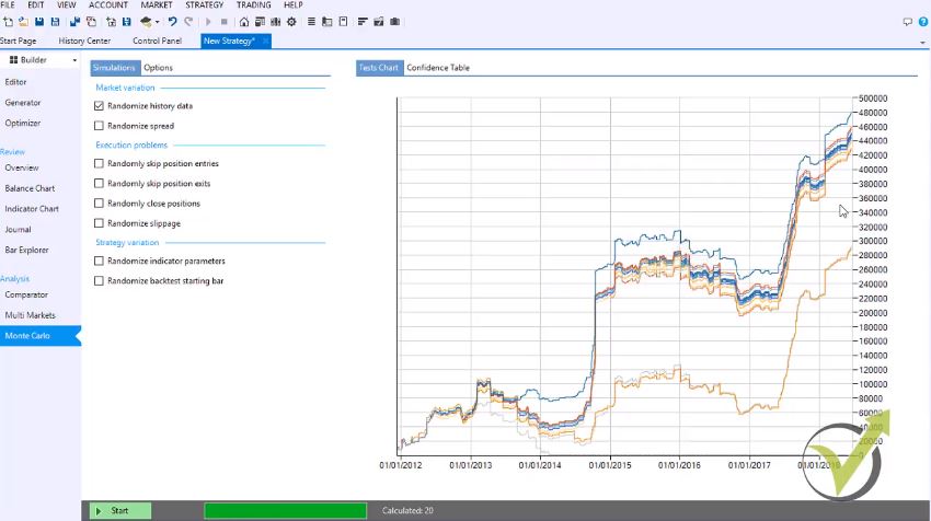 Below is the Monte Carlo which I have already explained. Here you can clarify how many counts of tests you’d like to take and below is how many of those tests to be validated. So, if I choose 10 tests and I wish 80 percent of those to be validated by the trading software, this means 8 out of the 10 should be validated. And if I select 20 obviously 16 out of the 20 should be validated.